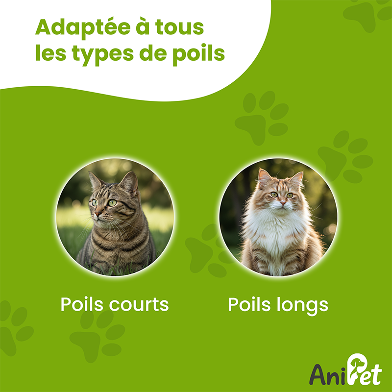 Elle convient à tous les types de poils et à toutes les races de chats, qu’ils aient un pelage fin, dense ou long.